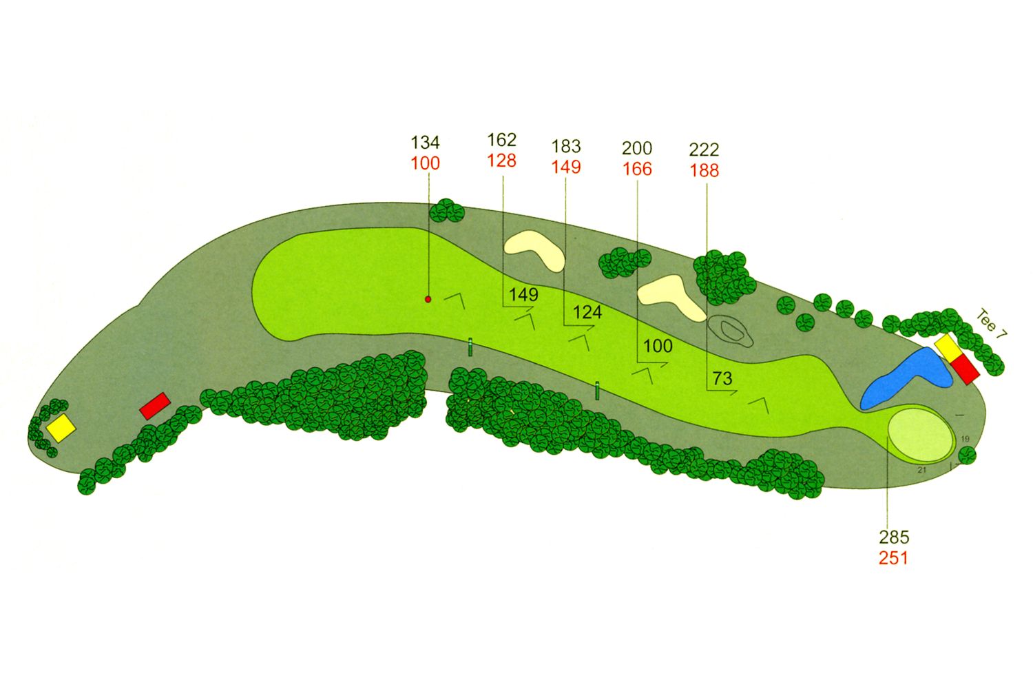 Der Abschlag muss entlang der Büsche und Bäume rechts gespielt werden. Wer die Länge hat, kann auch über die Bäume spielen. Das Fairway hängt nach dem Dogleg nach links.